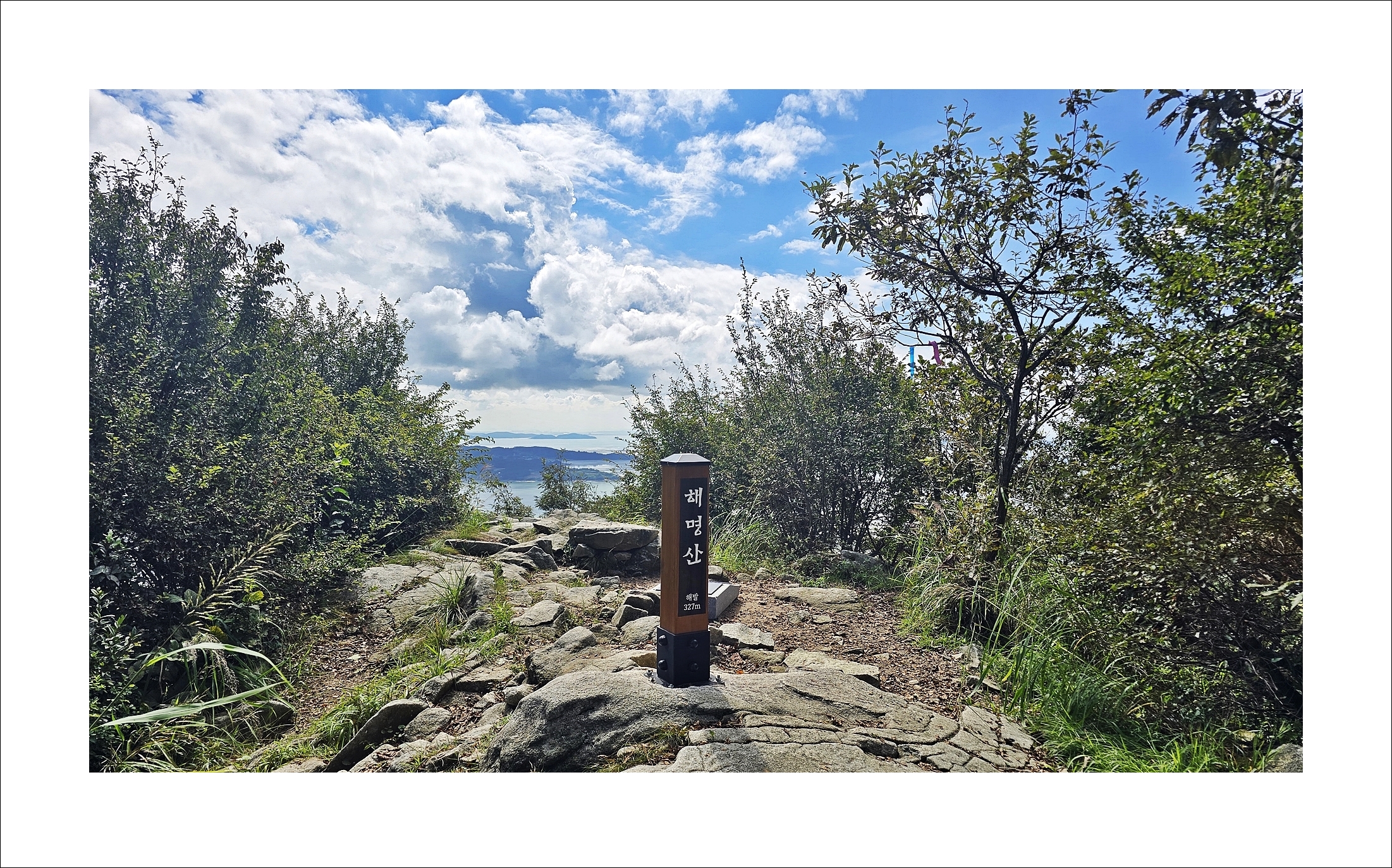 해명산 등산로 입구에 서면 도로 끝에 바로 바다가 보이는데 여기가 정말 이쁘다.